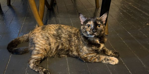 Pumpkin Pepper is a very lovey 1 year old female. She loves to be pet and be by your side. She is more interested in getting attention and being on your lap than playing. If you sit on a rug in the cafe, she will find your lap as a comfy spot to take a nap in. So make sure you give her all the cuddles, she is ready for them!